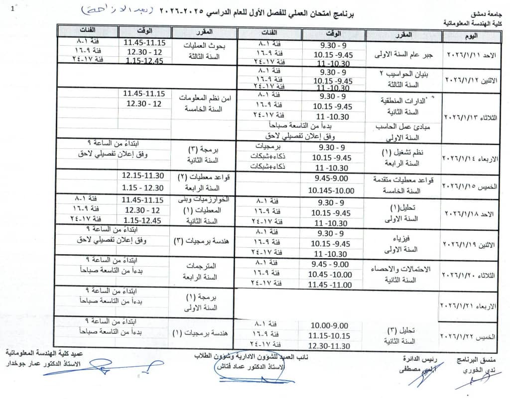 برنامج الامتحان العملي للفصل الاول