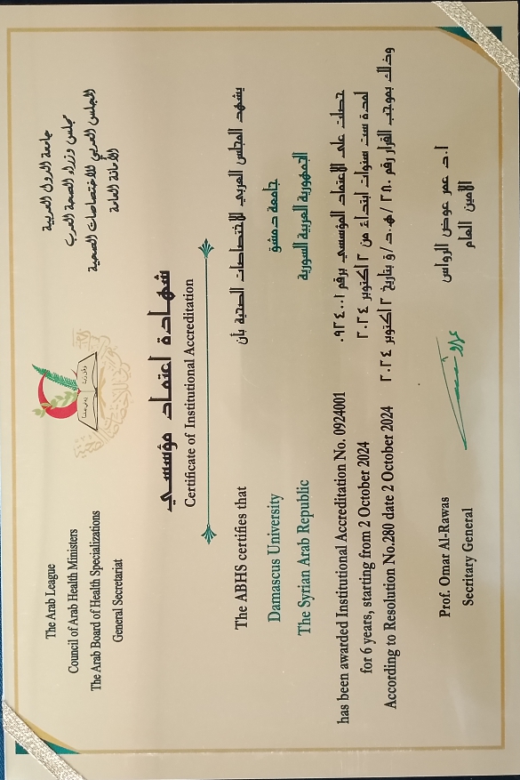 منح المجلس العربي للاختصاصات الصحية شهادة اعتماد مؤسسي لكلية الطب البشري لمدة ستة سنوات ابتداء من 2 اكتوبر 2024