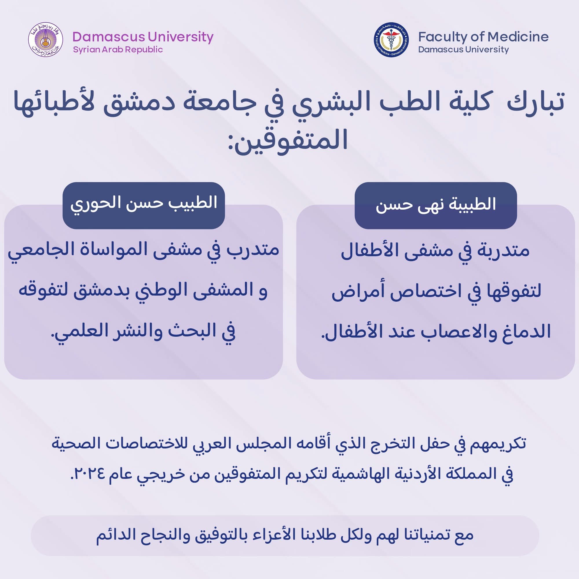 كرّم المجلس العربي للاختصاصات الصحية في حفل التخرج الذي الذي أقامه بتاريخ 16/10/2025 في عمان -المملكة الاردنية الهاشمية الطبيبة نهى حسن والطبيب حسن الحوري