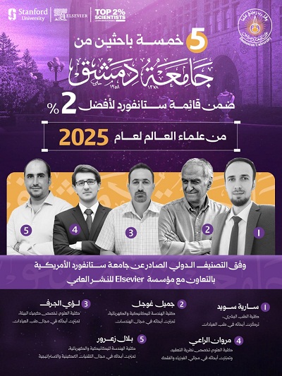أدرج تصنيف ستانفورد خمسة من علماء جامعة دمشق ضمن قائمة أفضل 2% من علماء العالم لعام 2025، وذلك وفق التصنيف الدولي الصادر عن جامعة ستانفورد الأمريكية في نهاية الثلث الثاني من أيلول 2025 بالتعاون مع مؤسسة Elsevier للنشر العلمي والذي يُعد من أبرز التصنيفات العالمية التي تقيس جودة الأبحاث العلمية ومدى تأثيرها على المستوى الدولي.