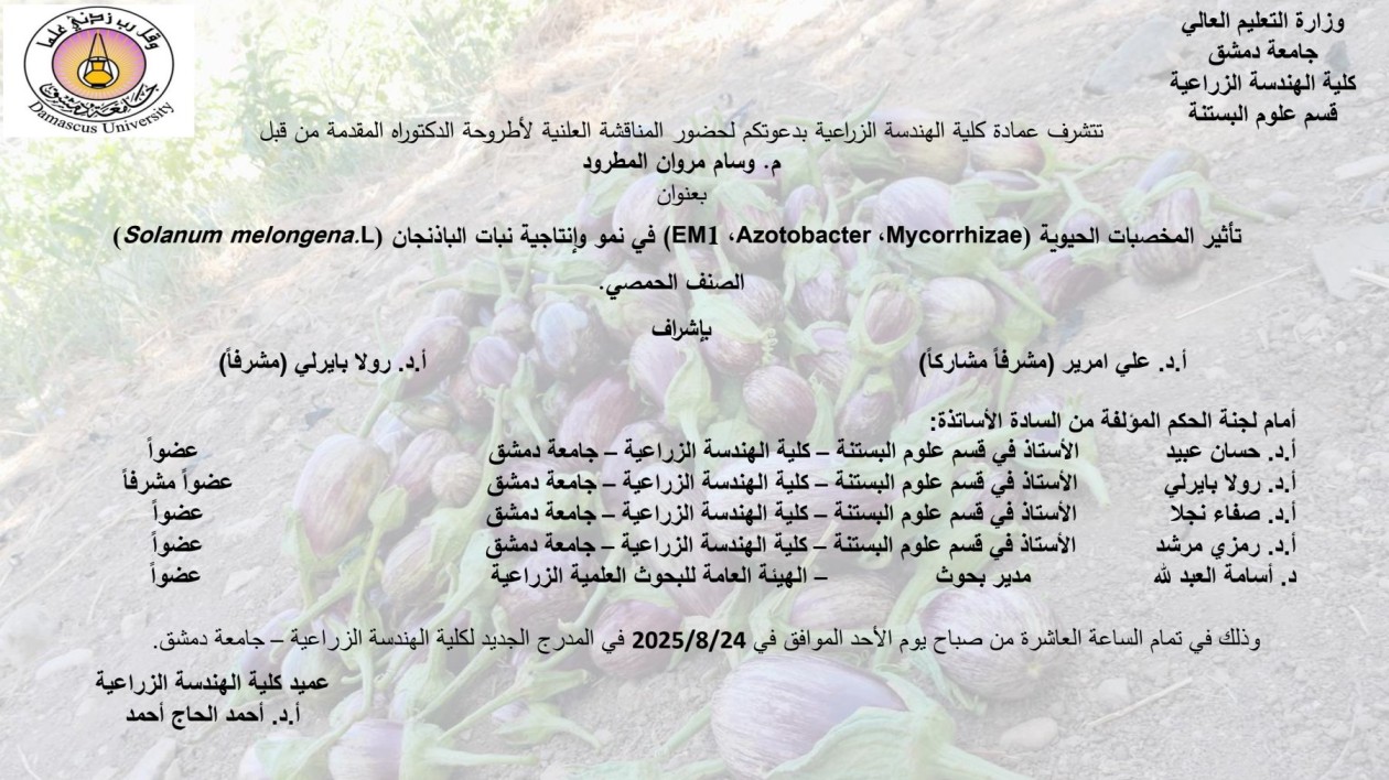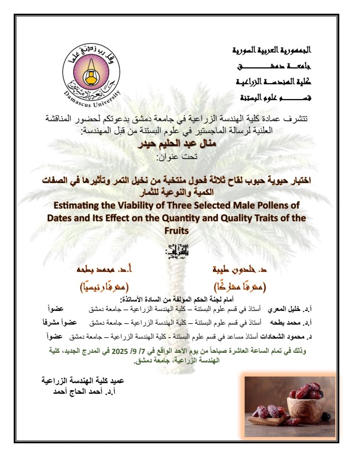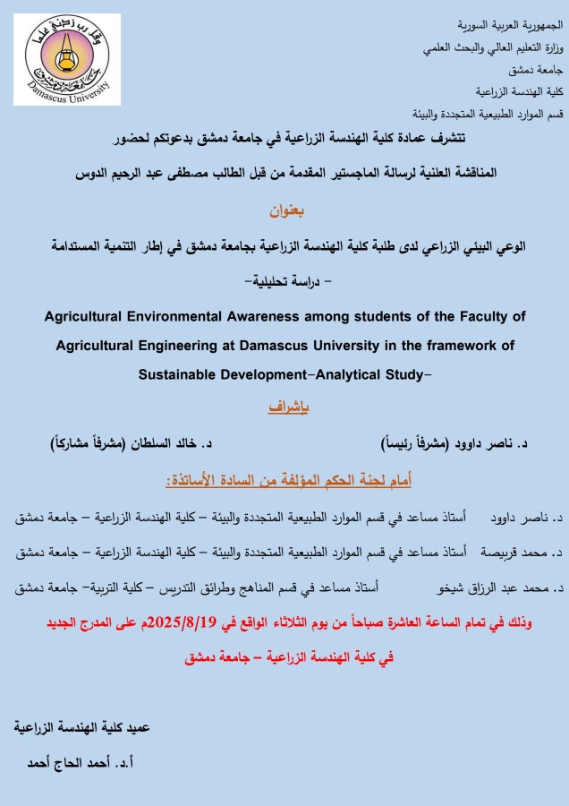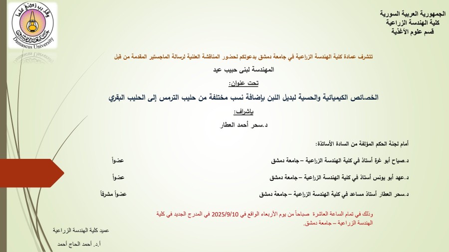 إعلان مناقشة #رسالة_ماجستير للمهندسة ريباس يوشع الشبقي بتاريخ 25-5-2025