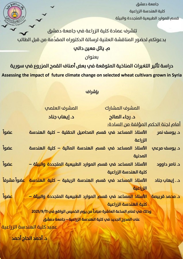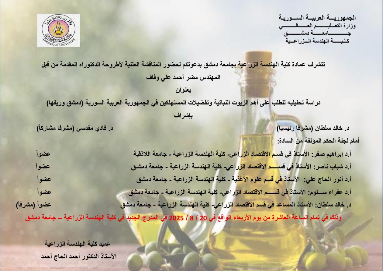 إعلان مناقشة أطروحة دكتوراه للمهندسة سميه أحمد جبل بتاريخ 13-8-2025