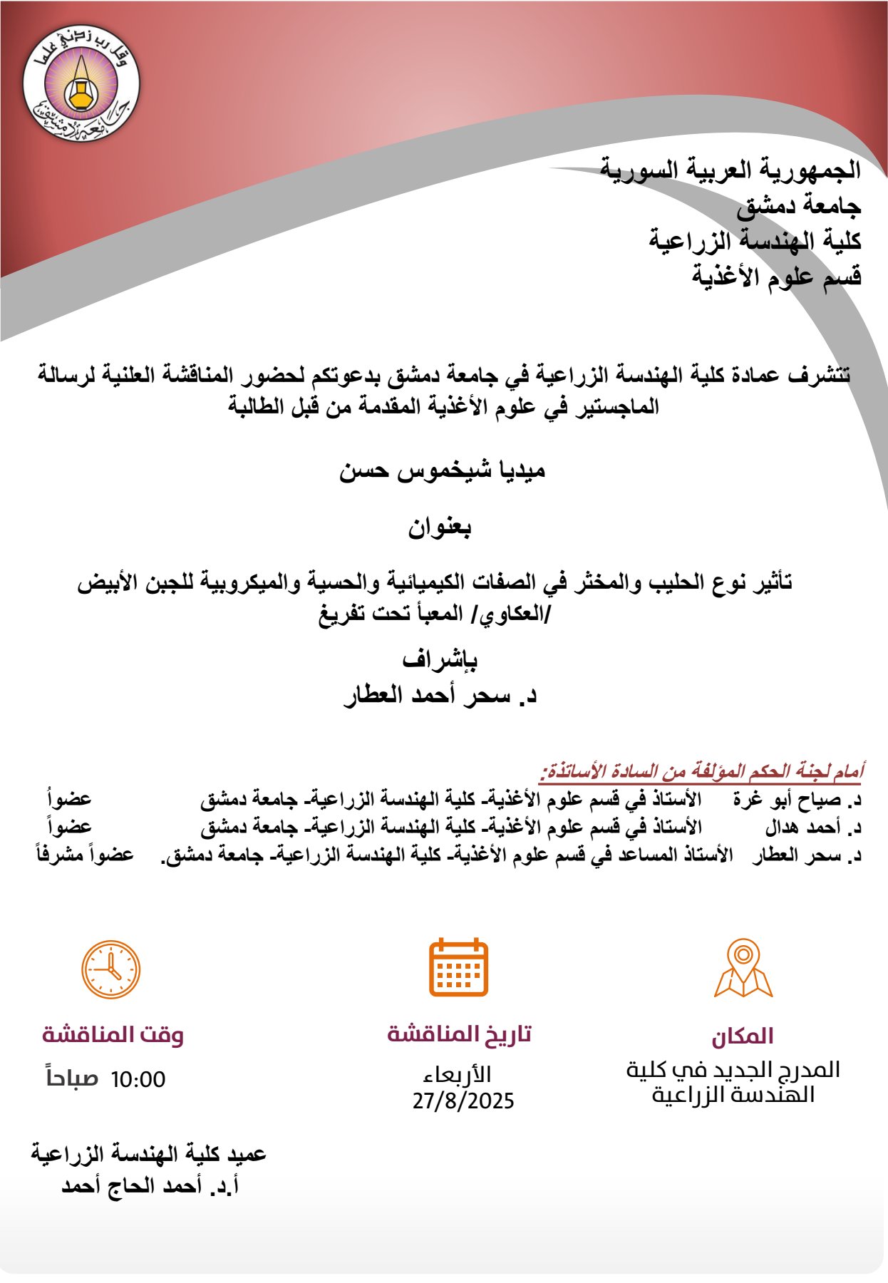 إعلان مناقشة #رسالة_ماجستير للمهندسة جواهر دحام الحسن بتاريخ 3-6-2025