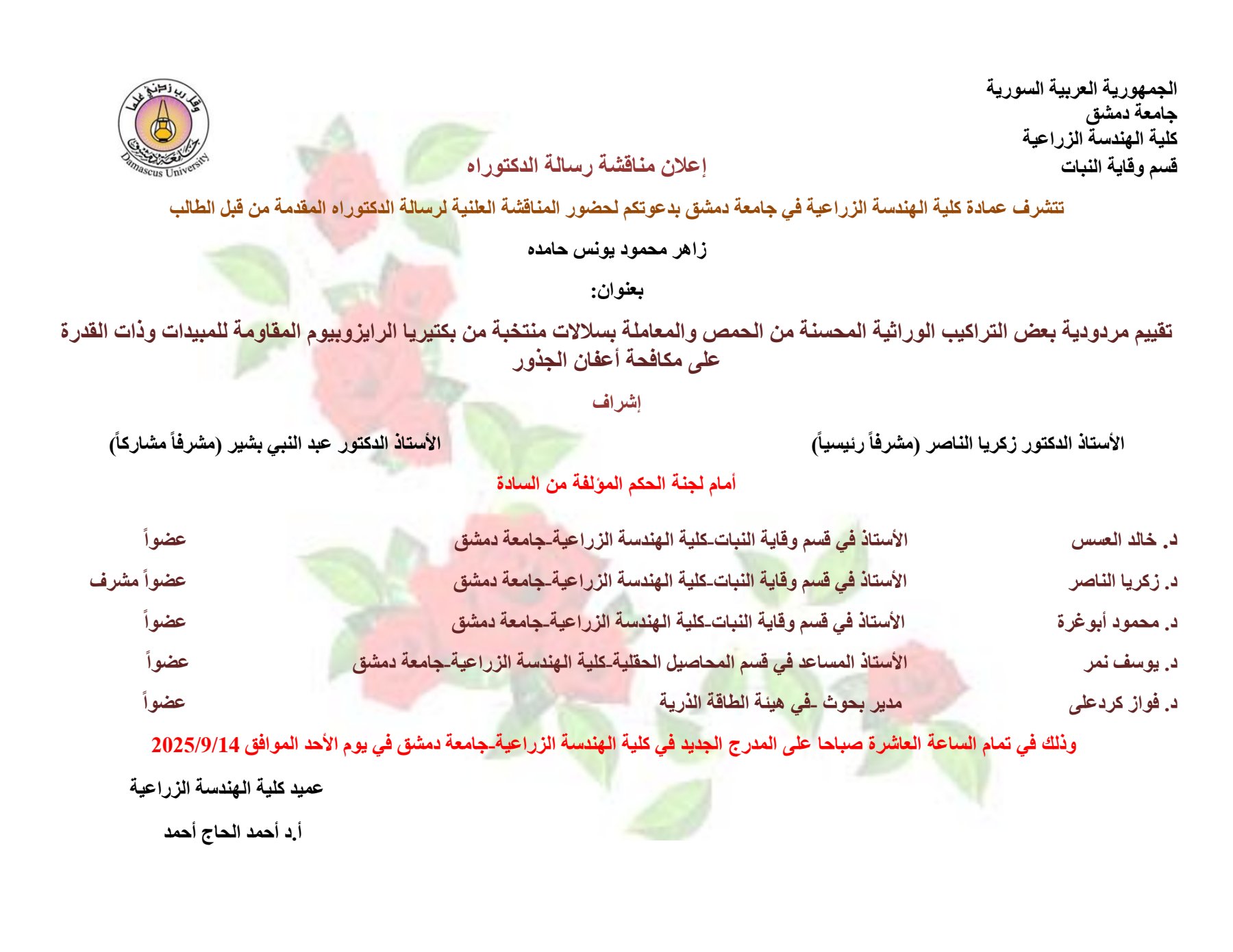 إعلان مناقشة أطروحة دكتوراه للمهندس محمد يوسف محمد الحقل بتاريخ 10-8-2025