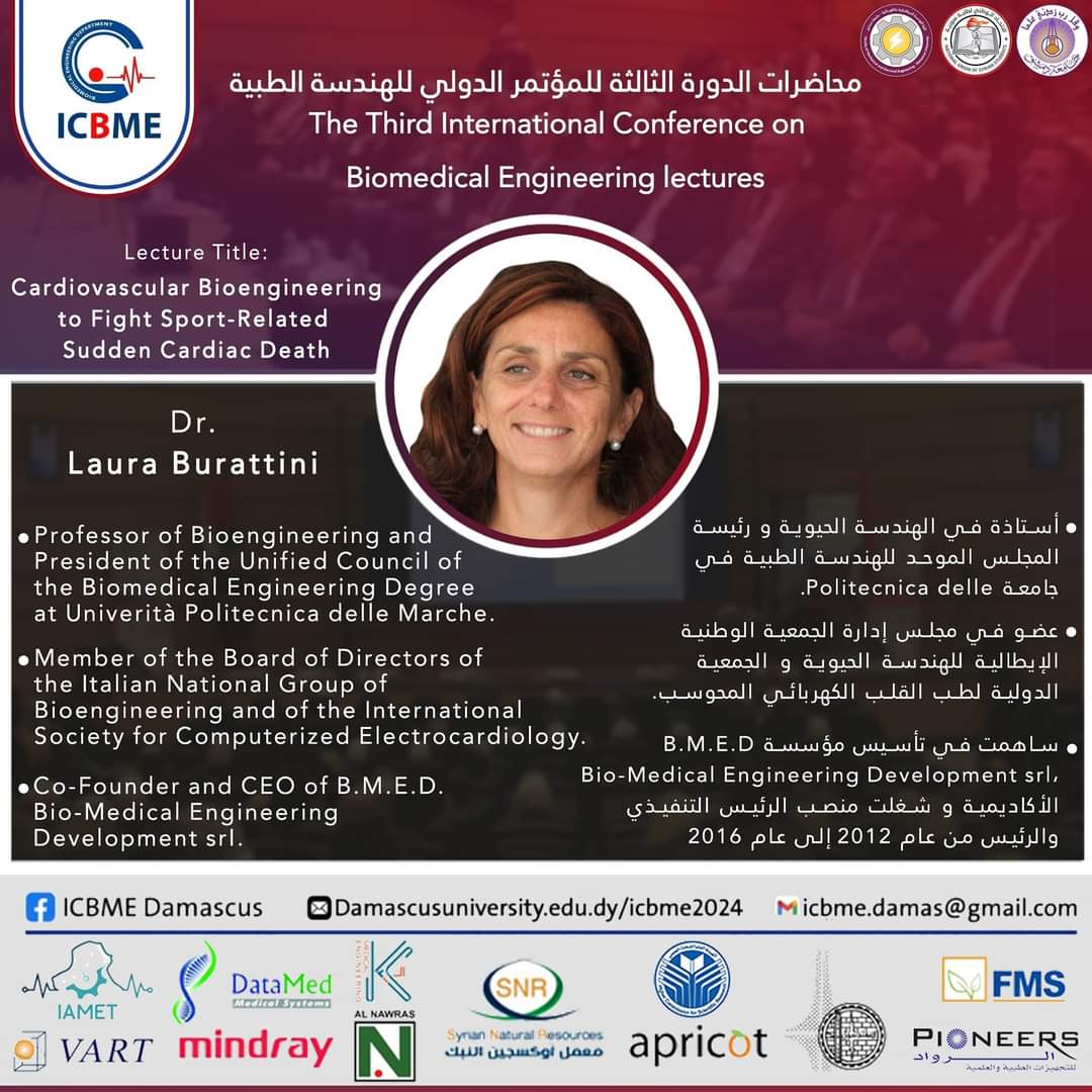 🔶 الأستاذة الدكتورة لورا بوراتيني حصلت لورا بوراتيني على درجة الدكتوراه في الهندسة الكهربائية/الهندسة الطبية الحيوية من جامعة روتشستر (الولايات المتحدة الأمريكية) في عام 1998 ودرجة الماجستير في الهندسة الكهربائية/الهندسة الطبية الحيوية من جامعة ميلانو التفنية (إيطاليا) في عام 1993. بعد تحصيلها على درجة الدكتوراه، اكتسبت بعض الخبرة العملية في الشركات الخاصة. انضمت منذ عام 2006 إلى قسم هندسة المعلومات في جامعة ماركي التقنية (إيطاليا) حيث تشغل حاليًا منصب عضو هيئة التدريس كأستاذ متفرغ للهندسة الطبية الحيوية ورئيسة المجلس الموحد لدرجة الهندسة الطبية الحيوية. تقوم بتدريس مقررات "الهندسة الحيوية" (درجة البكالوريوس) و"معالجة الإشارات والصور الطبية الحيوية" (درجة الماجستير)، وهي مسؤولة عن "مختبر الهندسة الحيوية للقلب والأوعية الدموية" و"مختبر الهندسة الحيوية