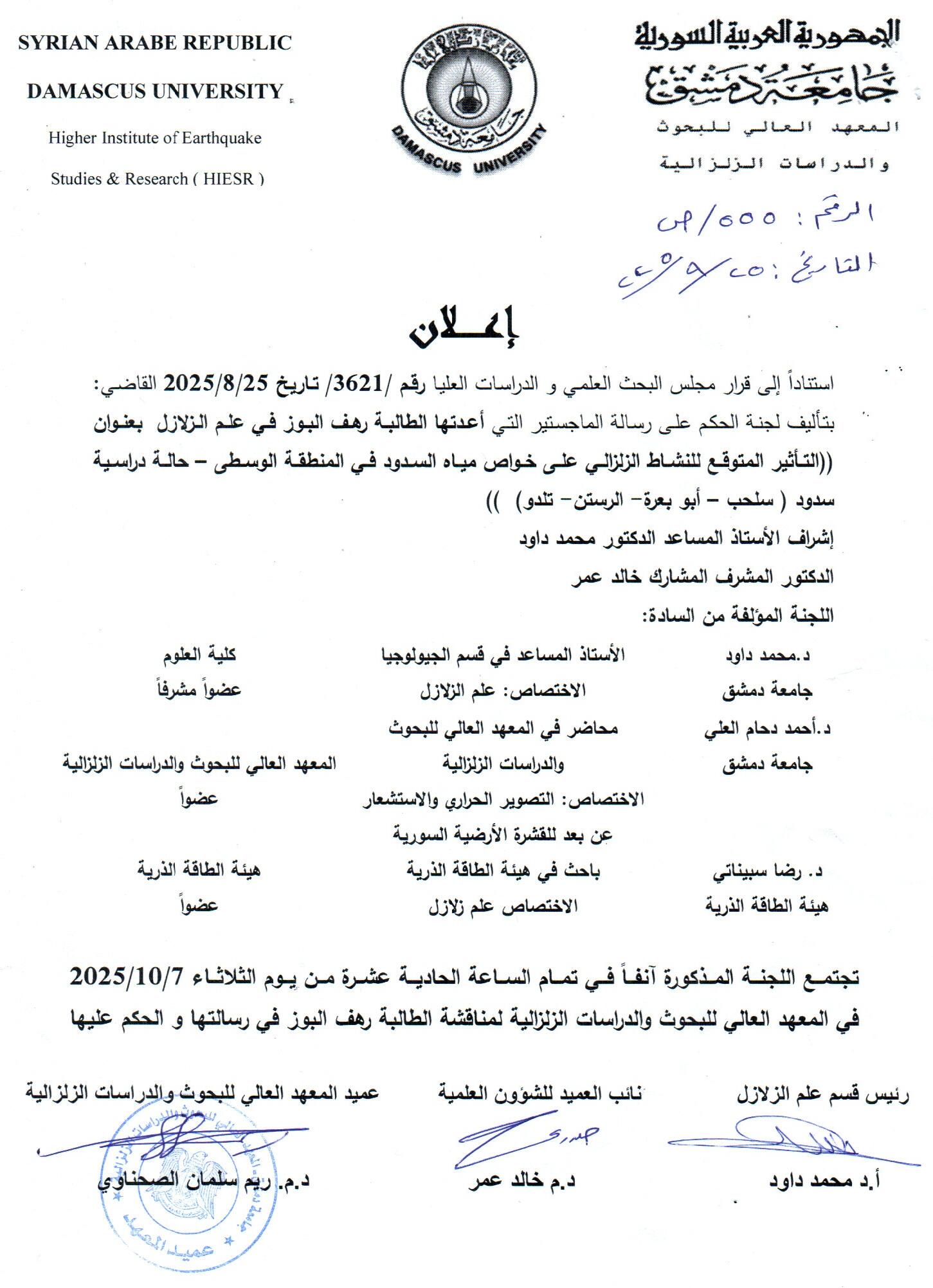 اعلان سيمنار تسجيل لرسالة الماجستير-سيمنار تسجيل الطالبة لجين كحلية - علم الزلازل
