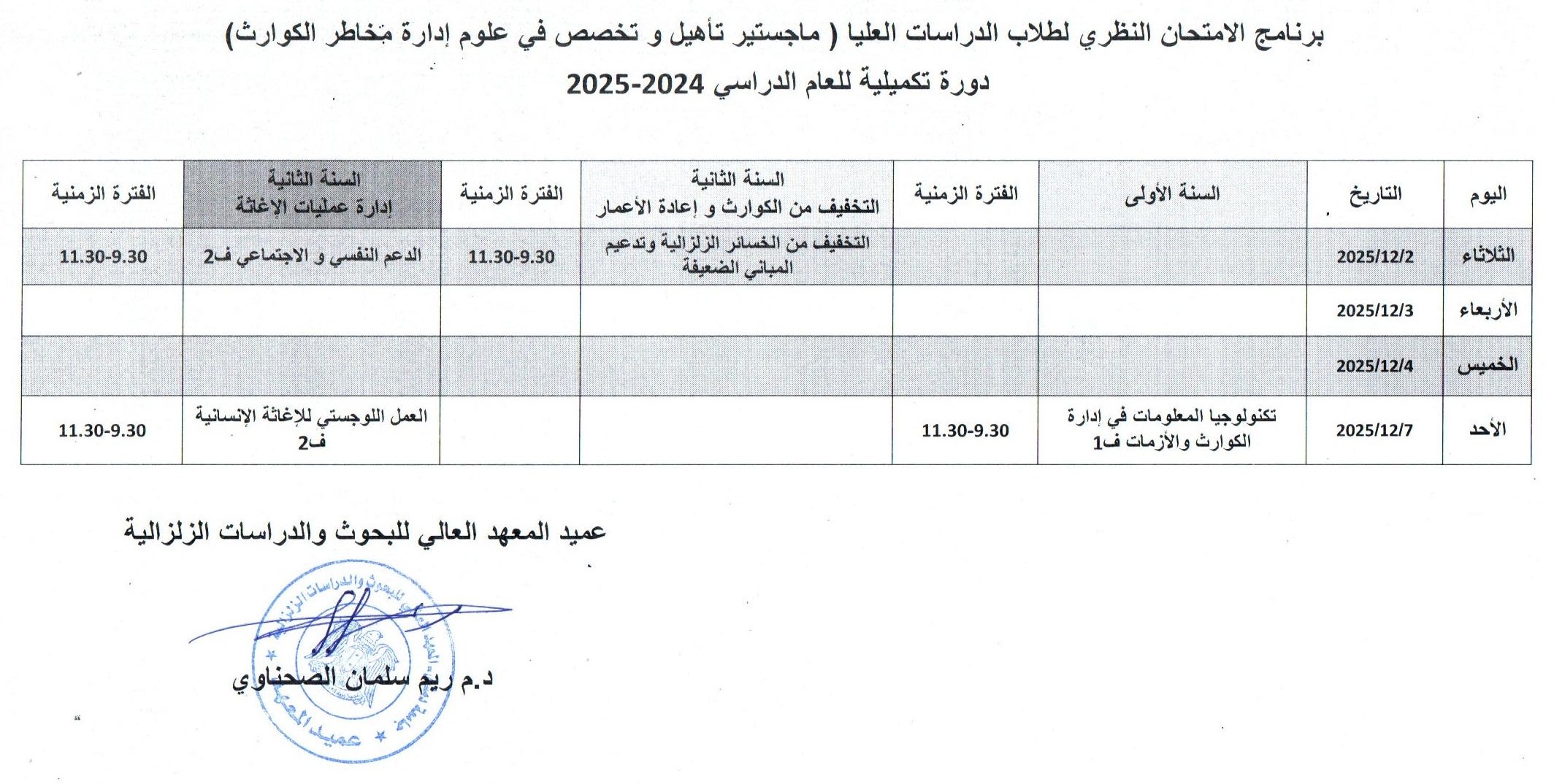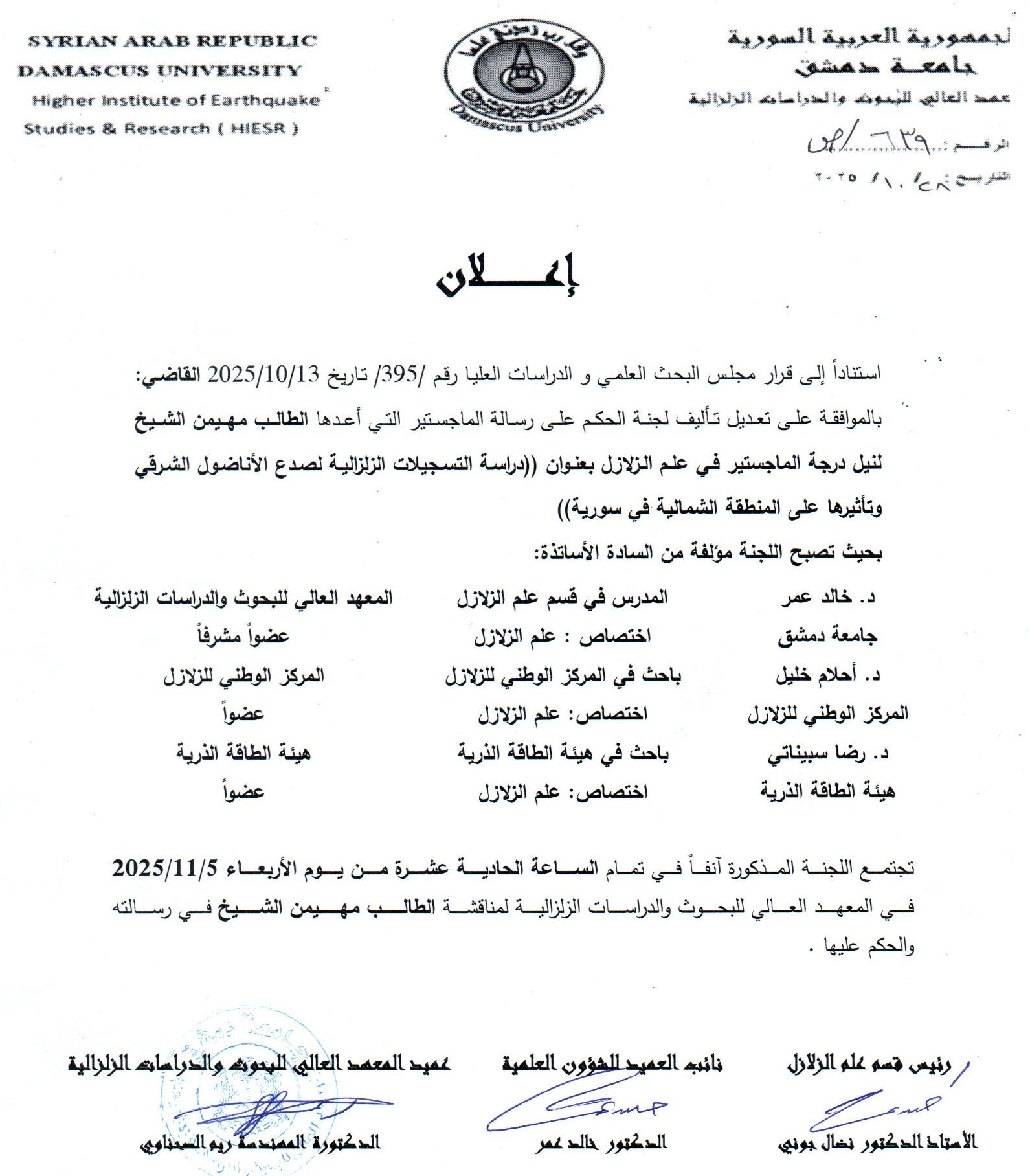 اعلان سيمنار مرحلي رابع لرسالة الماجستير -محمد ياسر شرف الدين - قسم علم الزلازل