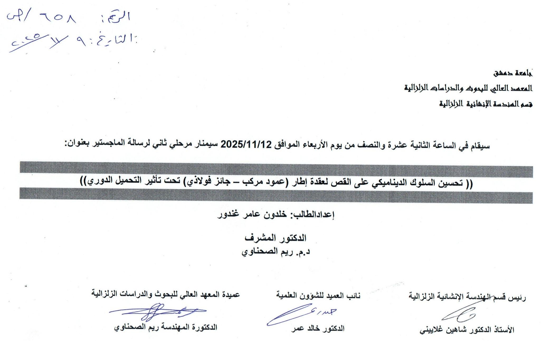 تعلان سيمنار ثاني لرسالة الماجستير - قسم الهندسة الإنشائيةالزلزالية - الطالب علي الرواس