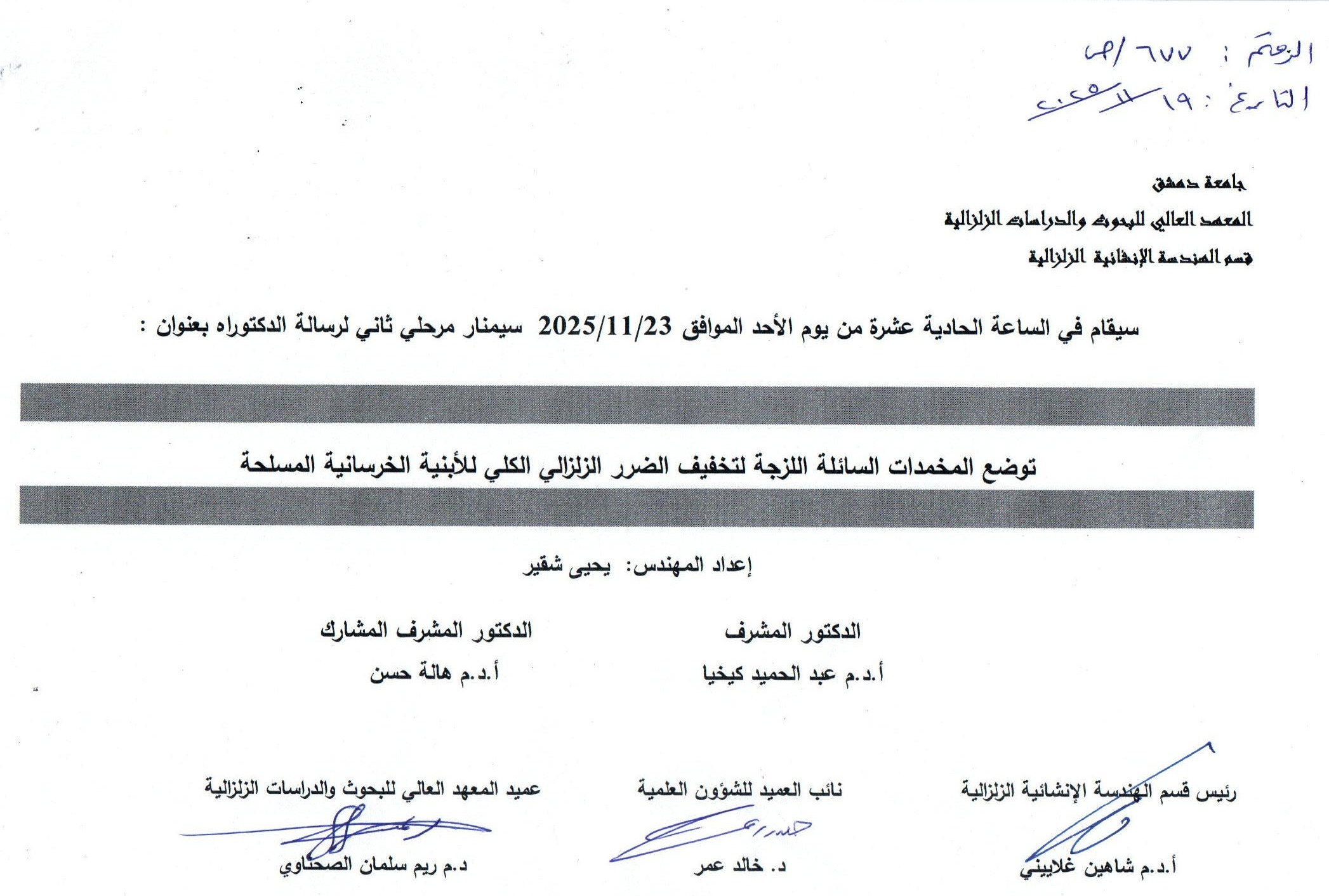 اعلان سيمنار مرحلي رابع لرسالة الدكتوراه - المهندسة ميساء العرب - قسم الهندسة الإنشائية الزلزالية