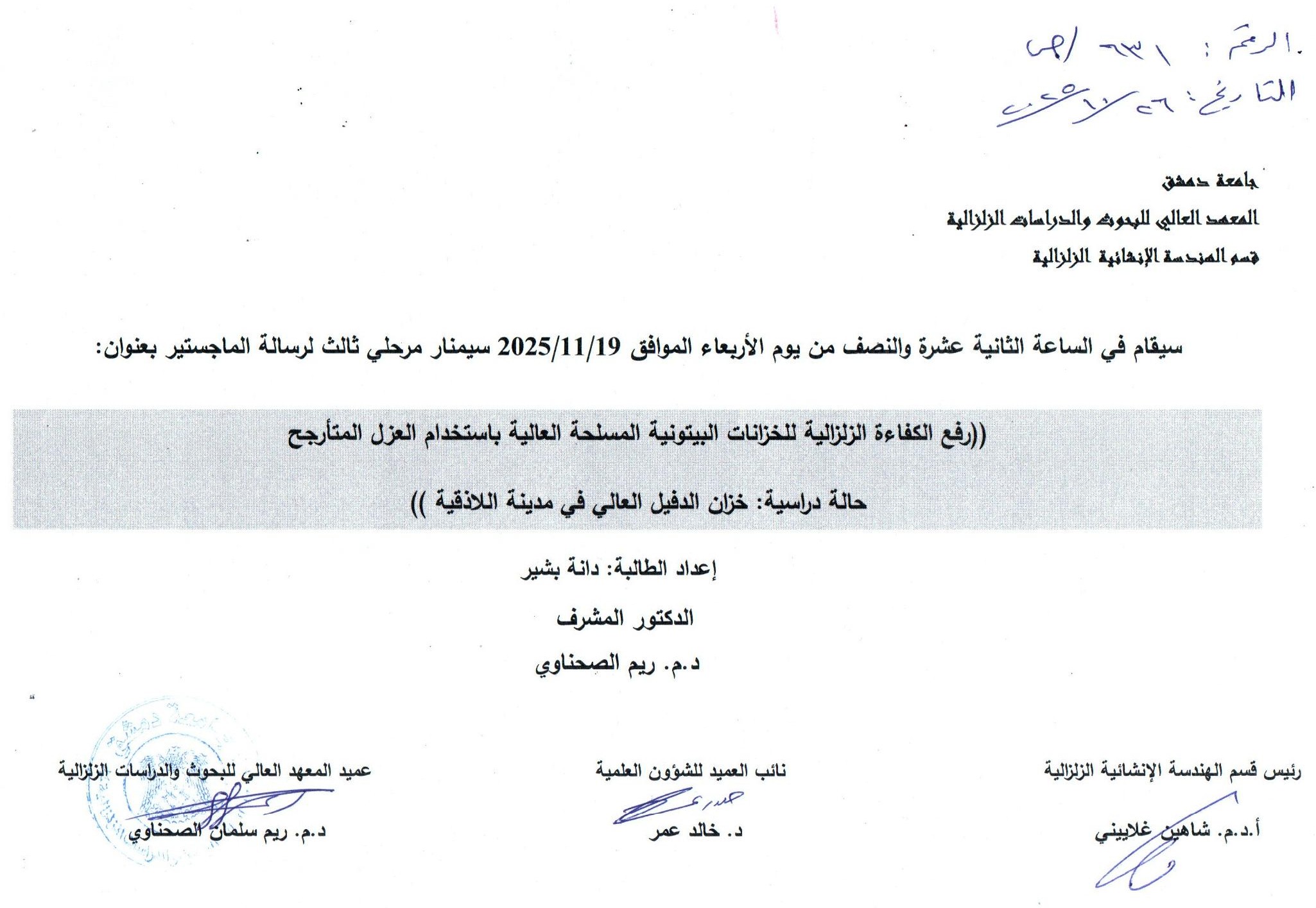 اعلان سيمنار مرحلي ثالث لرسالة الماجستير - الطالبة ماري جبلي قسم الهندسة الإنشائية الزلزالية