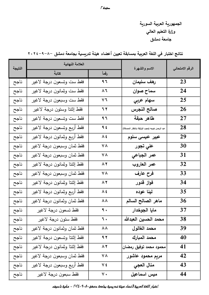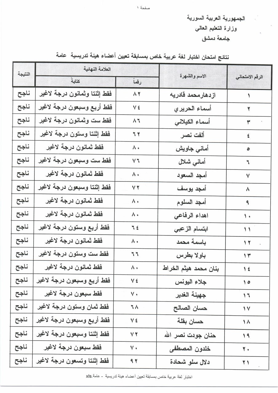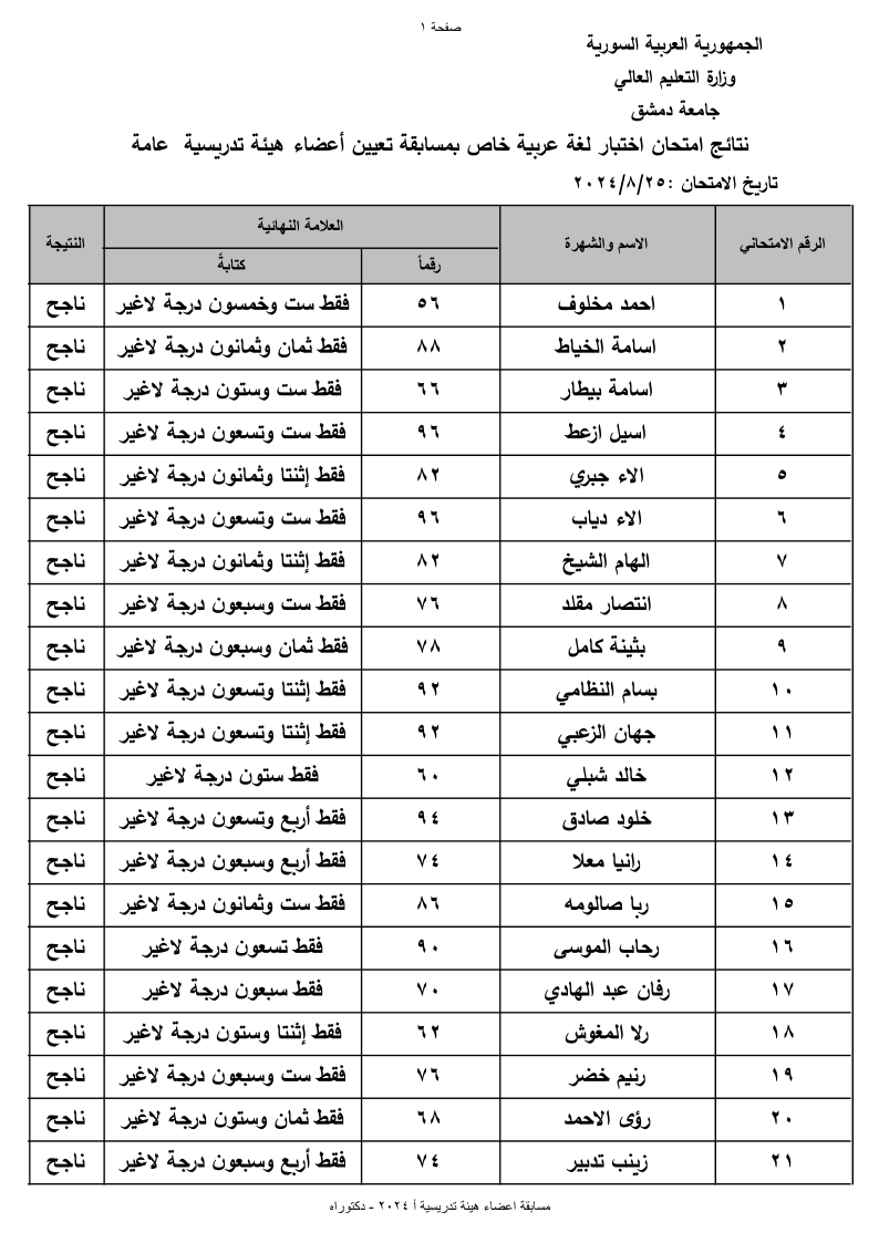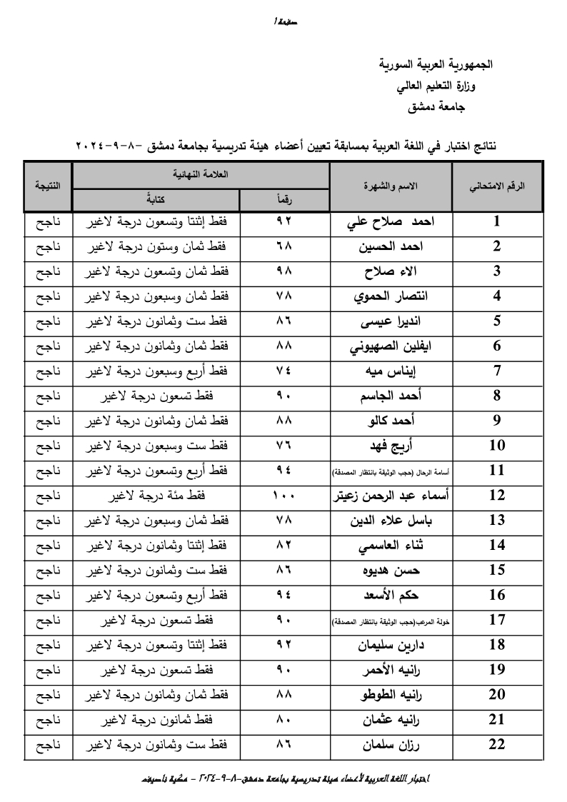 نتائج اختبار اللغة العربية الخاص بمسابقة تعيين اعضاء الهيئة التدريسية بجامعة دمشق حيث جرى الامتحان الساعة 10.00 من يوم الاحد 25-8-2024