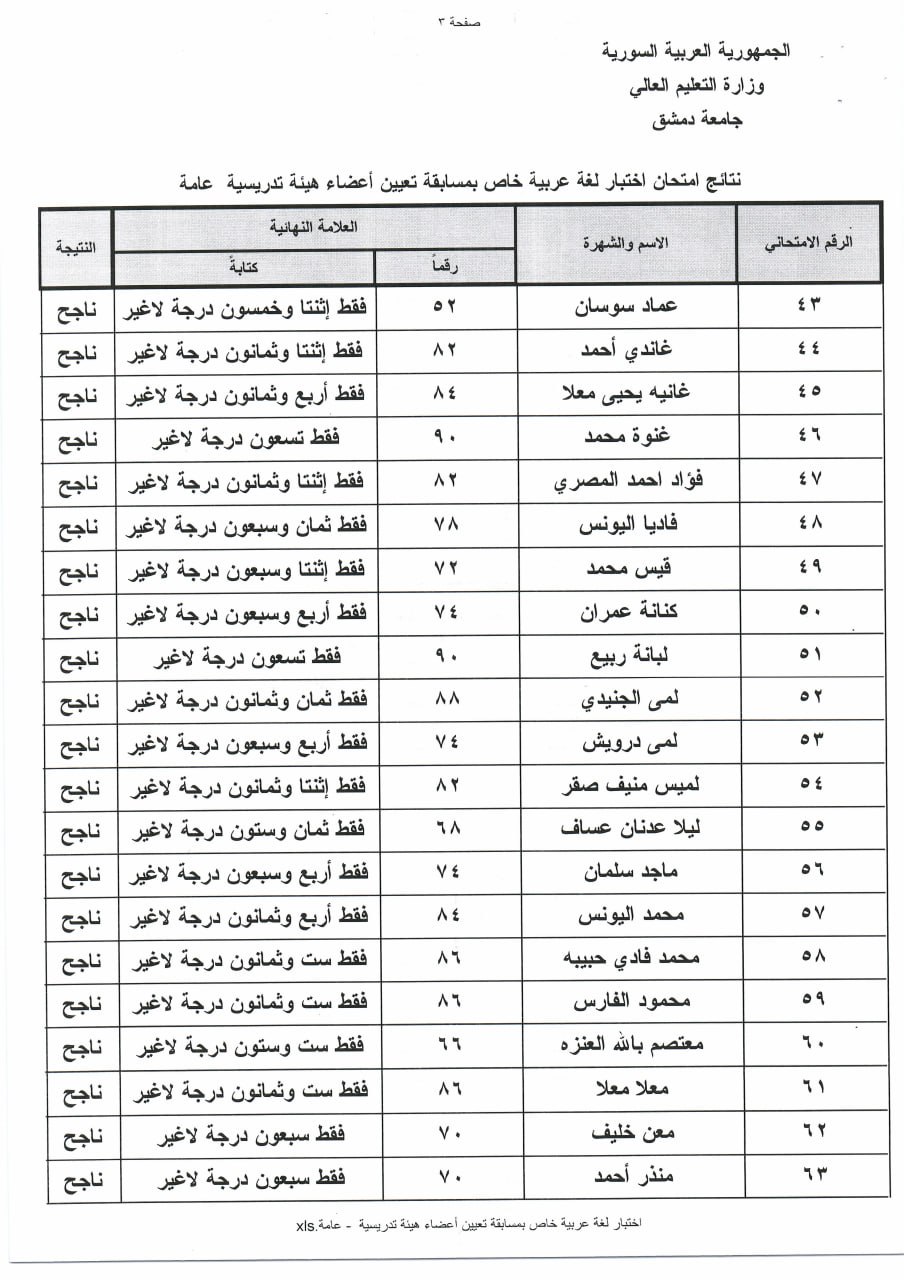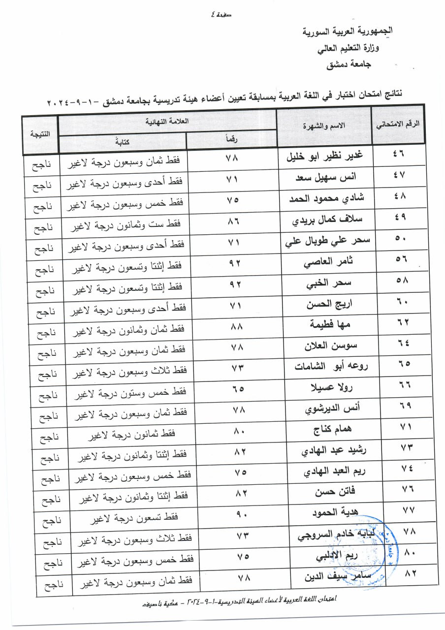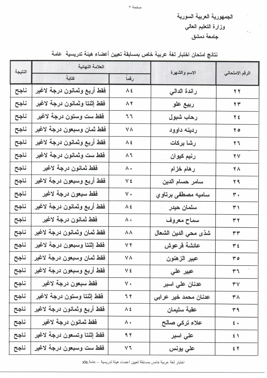نتائج اختبار اللغة العربية الخاص بمسابقة تعيين اعضاء الهيئة التدريسية بجامعة دمشق حيث جرى الامتحان الساعة 10.00 من يوم الاحد 25-8-2024