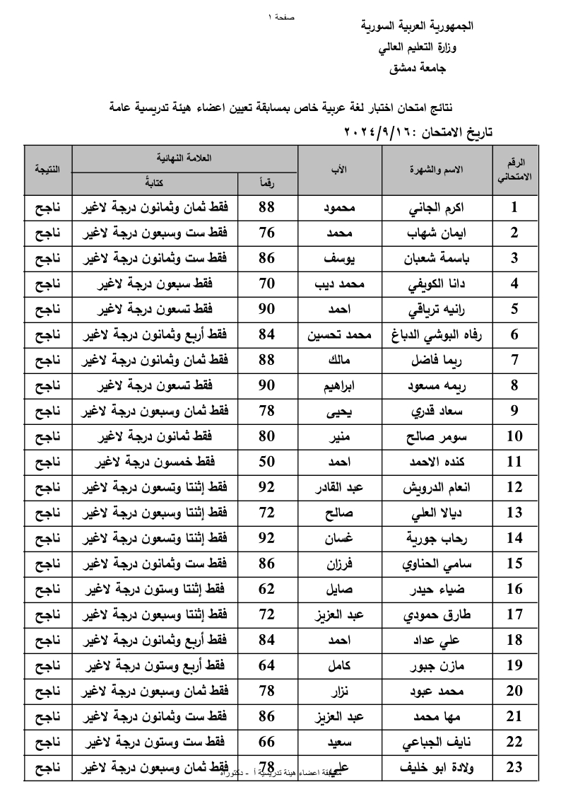نتائج اختبار اللغة العربية الخاص بمسابقة تعيين اعضاء الهيئة التدريسية بجامعة دمشق حيث جرى الامتحان الساعة 10.00 من يوم الاثنين 23-9-2024