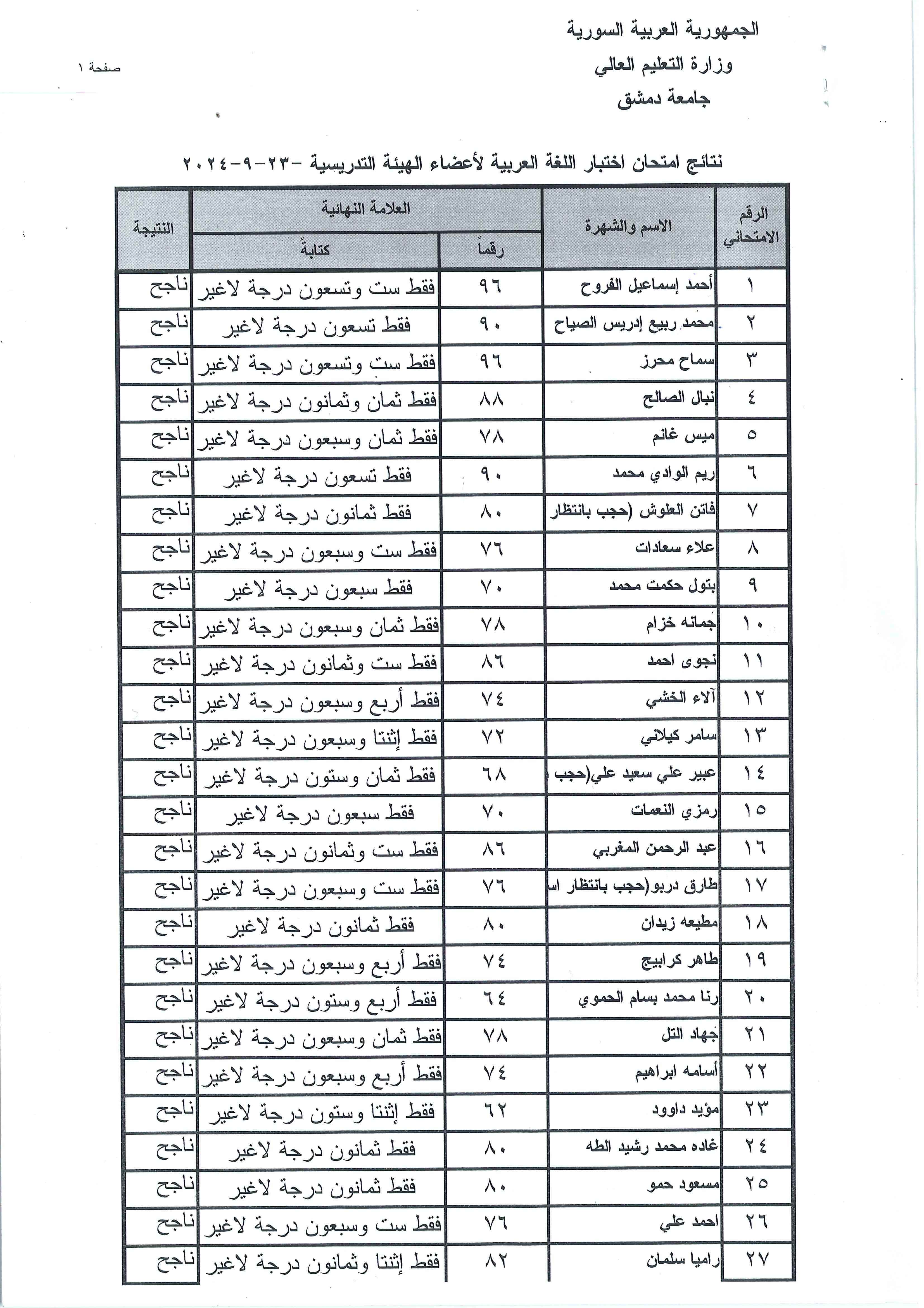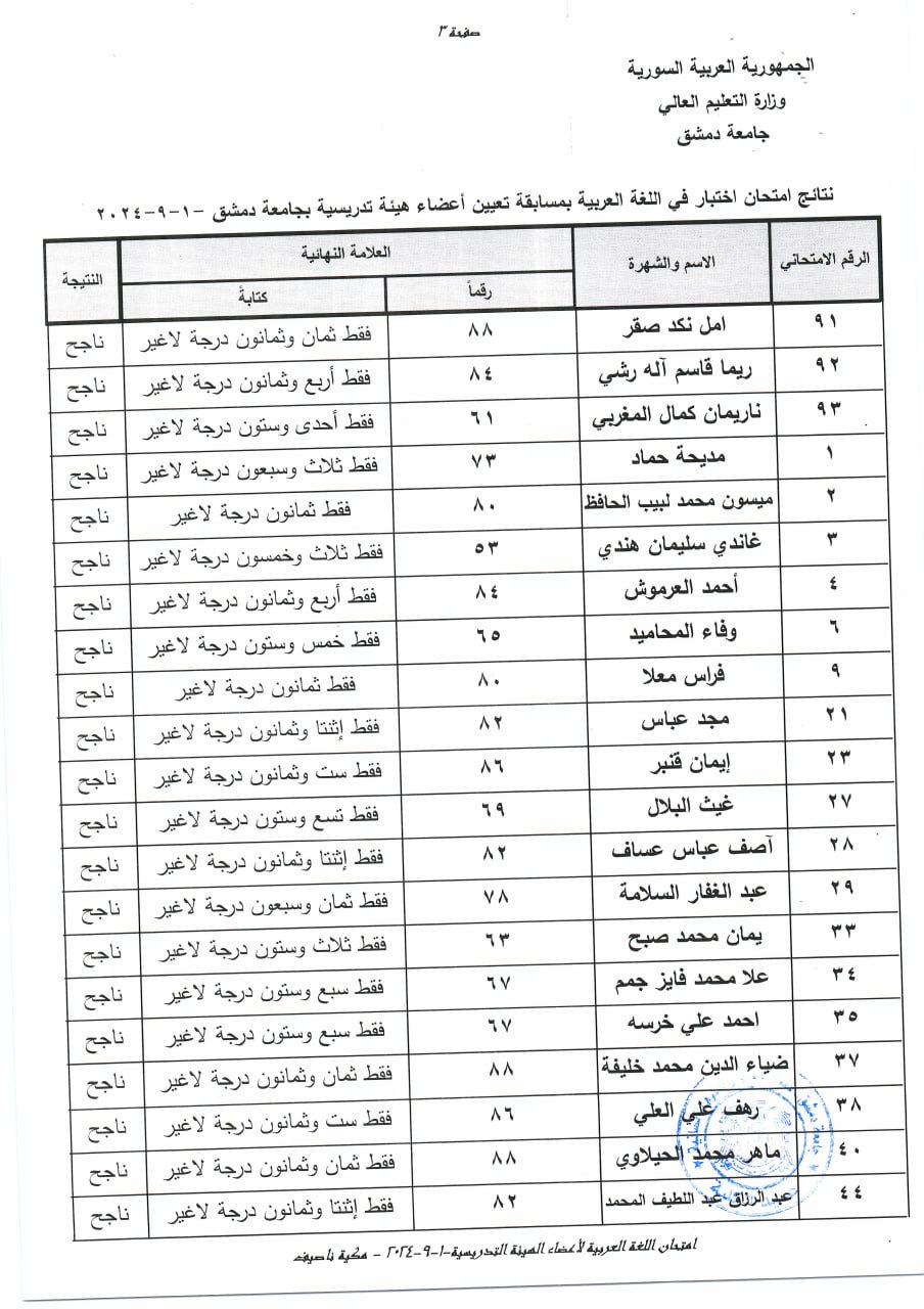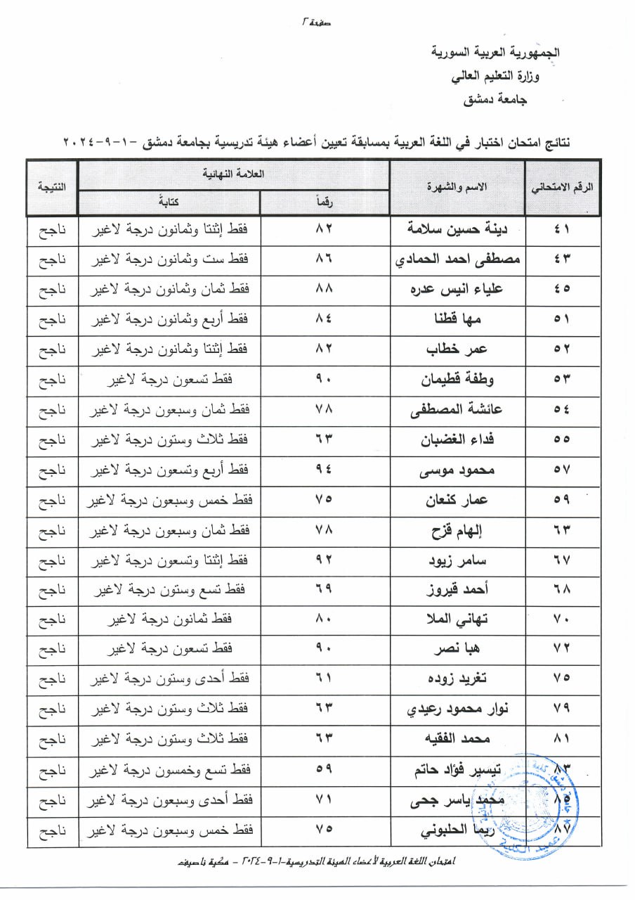 نتائج اختبار اللغة العربية الخاص بمسابقة تعيين اعضاء الهيئة التدريسية بجامعة دمشق حيث جرى الامتحان الساعة 10.00 من يوم الاحد 1-9-2024