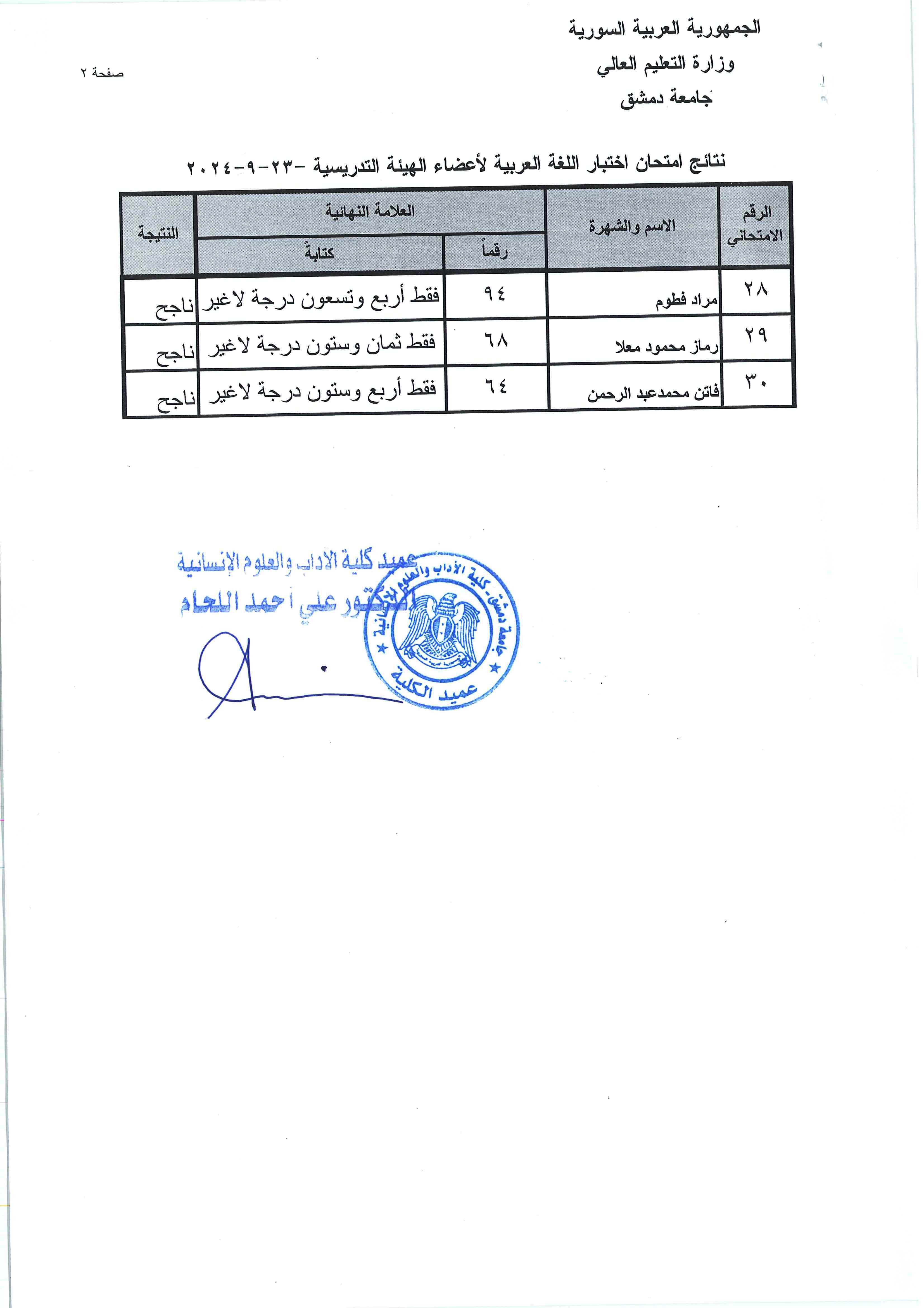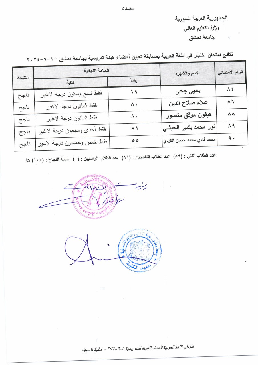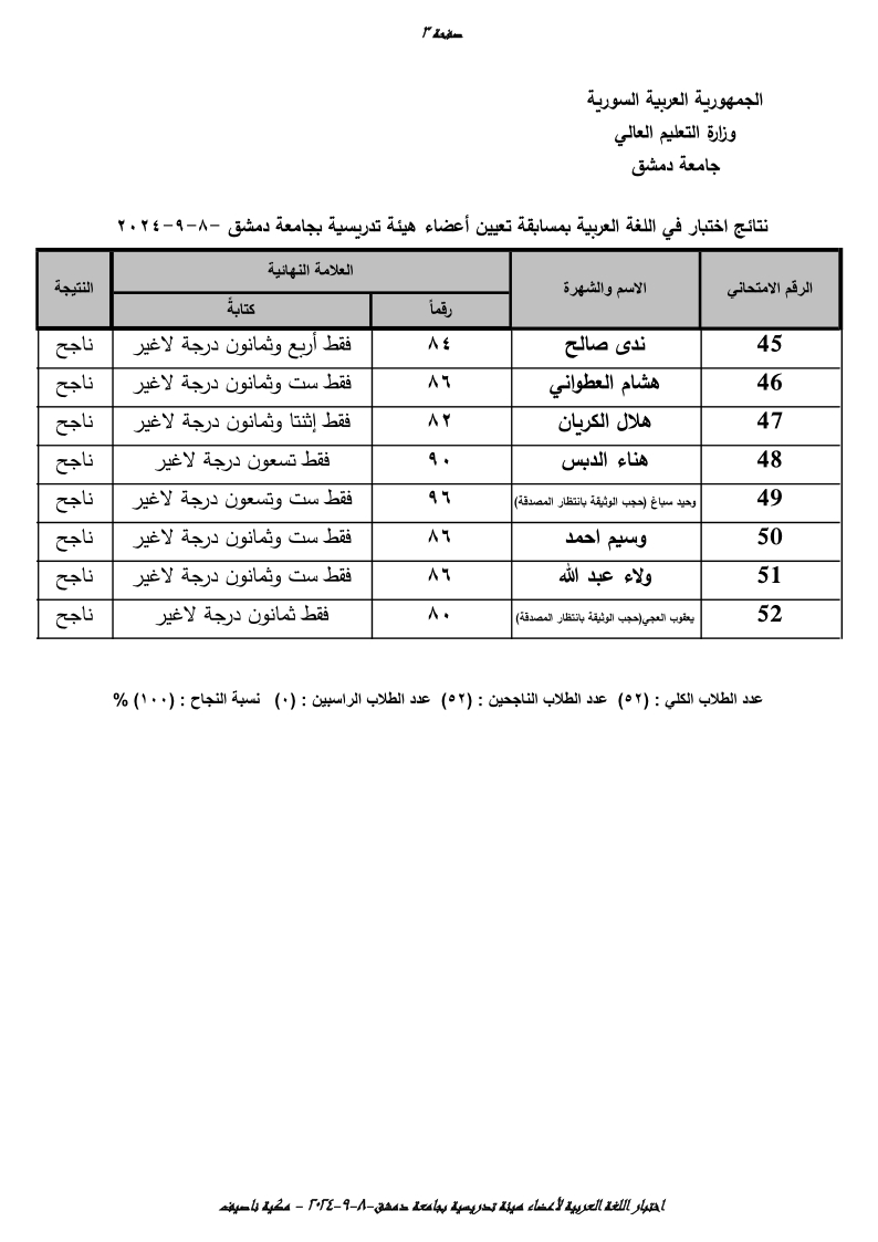 نتائج اختبار اللغة العربية الخاص بمسابقة تعيين اعضاء الهيئة التدريسية بجامعة دمشق حيث جرى الامتحان الساعة 10.00 من يوم الاحد 1-9-2024