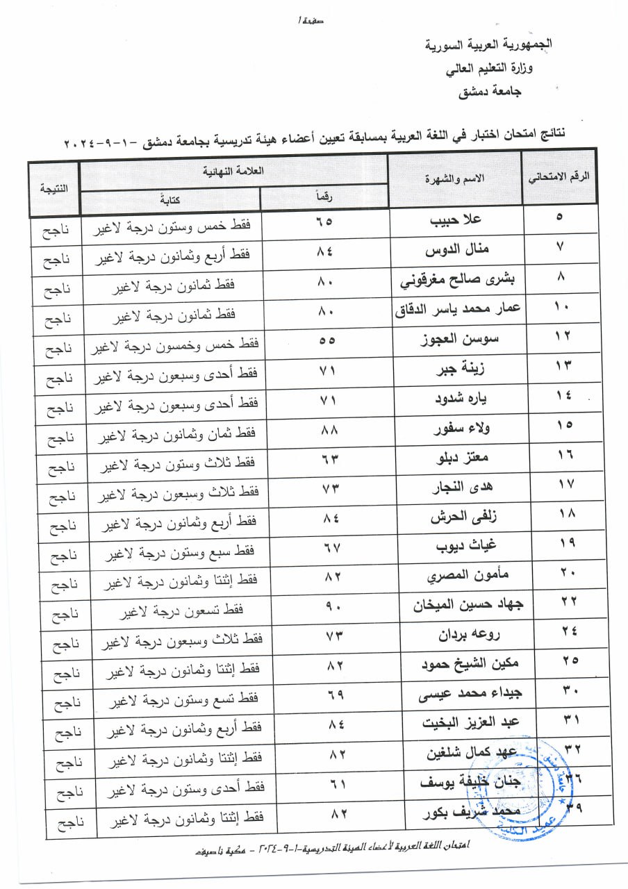 نتائج اختبار اللغة العربية الخاص بمسابقة تعيين اعضاء الهيئة التدريسية بجامعة دمشق حيث جرى الامتحان الساعة 10.00 من يوم الاثنين 16-9-2024