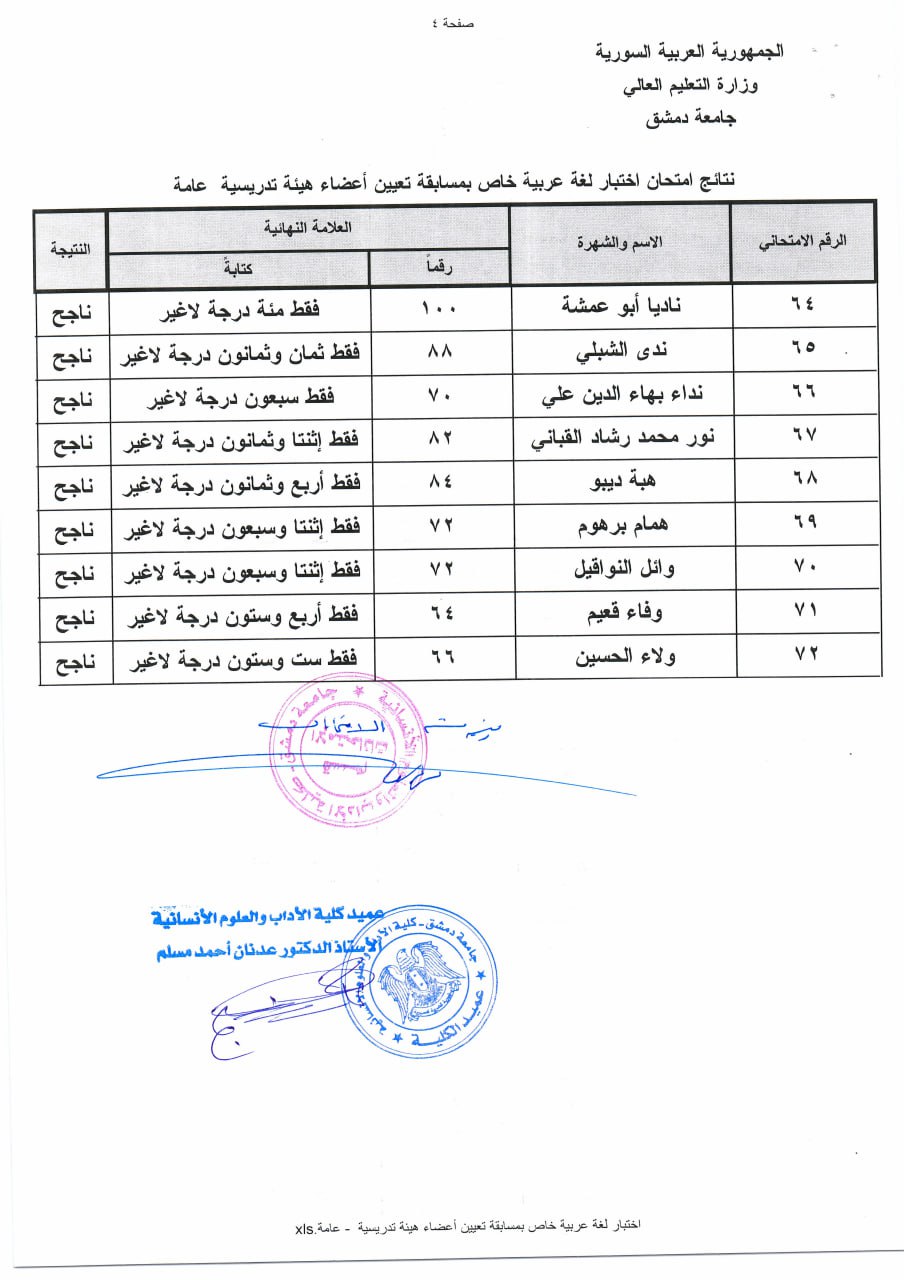نتائج اختبار اللغة العربية الخاص بمسابقة تعيين اعضاء الهيئة التدريسية بجامعة دمشق حيث جرى الامتحان الساعة 10.00 من يوم الاحد 18-8-2024 وصدرت النتائج في الساعة 1.00 ظهرا من نفس اليوم