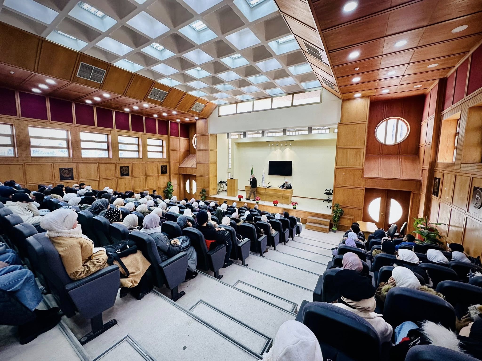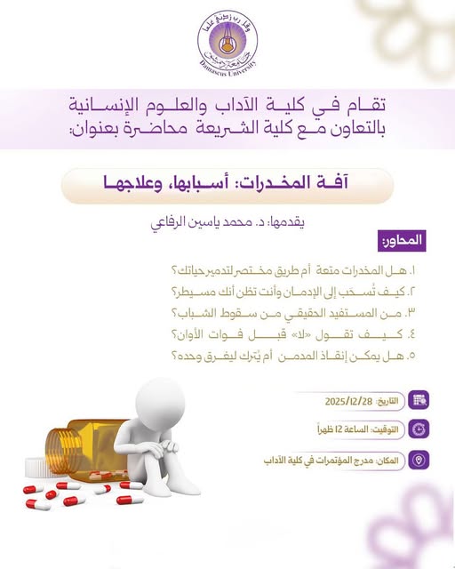 من أجواء محاضرة «آفة المخدرات: أسبابها وعلاجها» التي نظّمتها كلية الشريعة بالتعاون مع كلية الآداب والعلوم الإنسانية، برعاية جامعة دمشق، وقدّمها الدكتور محمد ياسين الرفاعي.